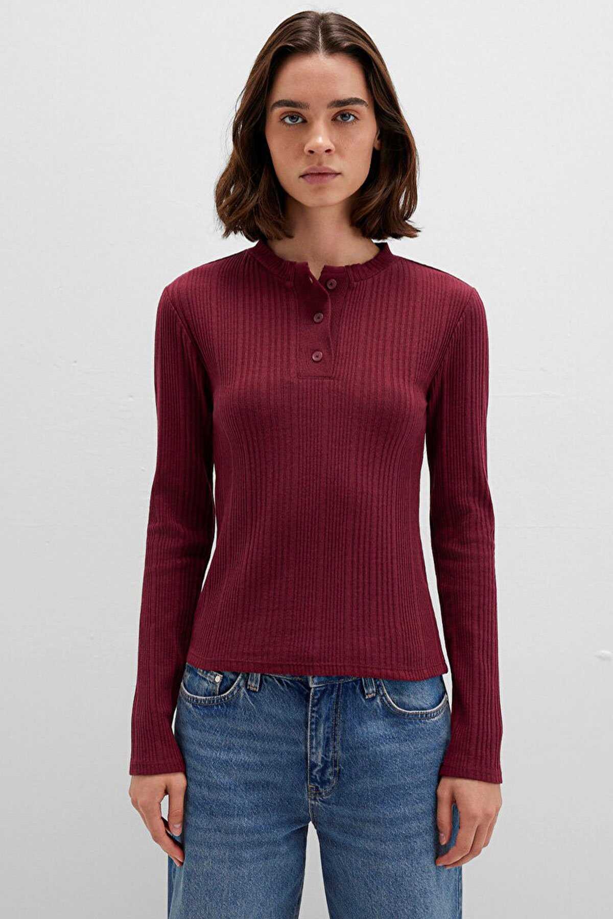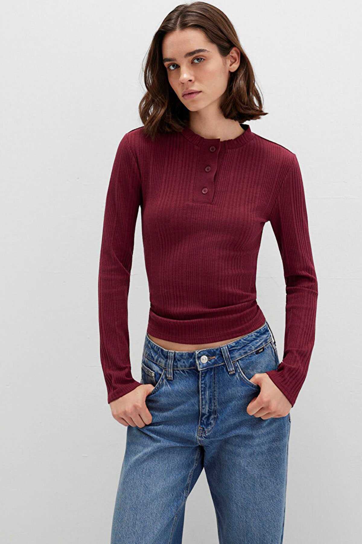 Mavi nin kadın koleksiyonundan Düğme Detaylı Bordo Tişört. - Fitted Vücuda Oturan Kesim - Ürün Kodu: 1613374-70427 - Manken Ölçüleri - Jean: Bel: 26 Boy: 32 Üst: S - Boy: 179 cm Bel: 59 cm Göğüs: 84 cm Kalça: 90 cm - Menşei: Türkiye