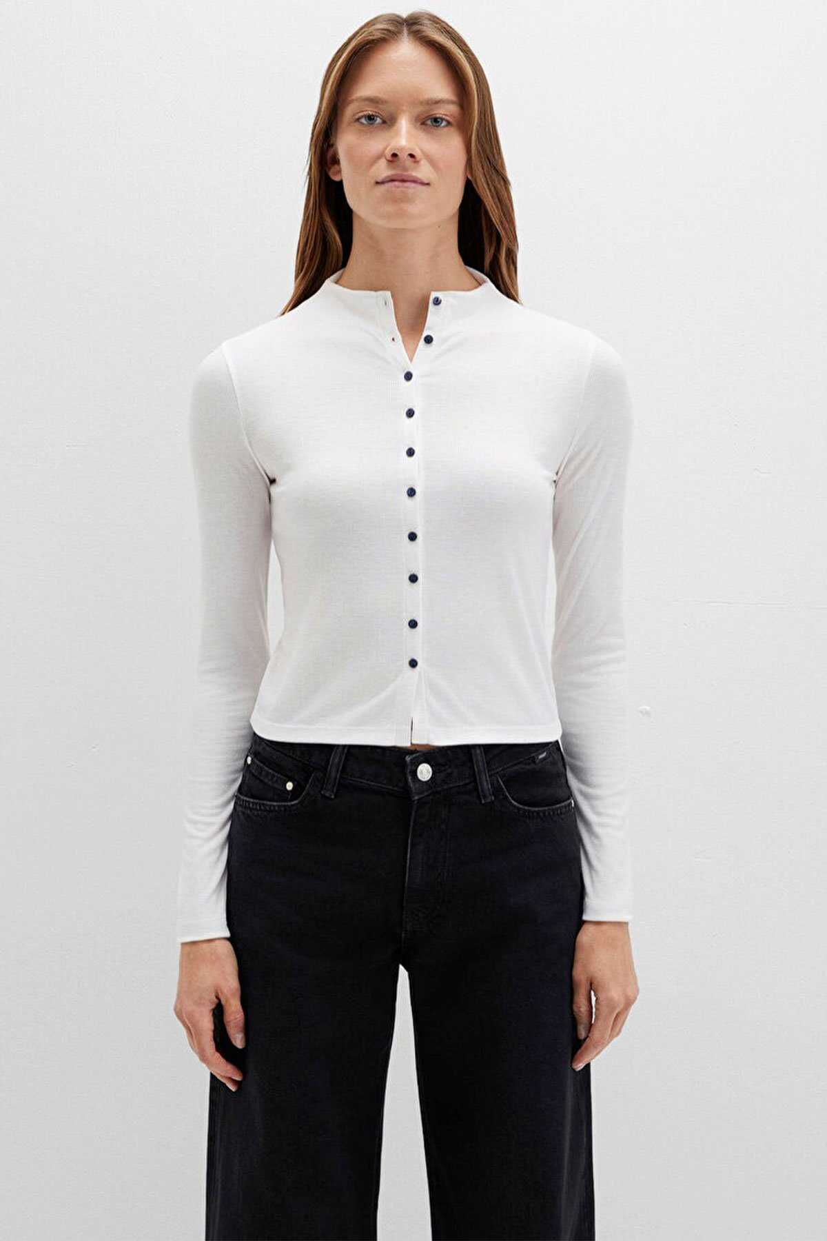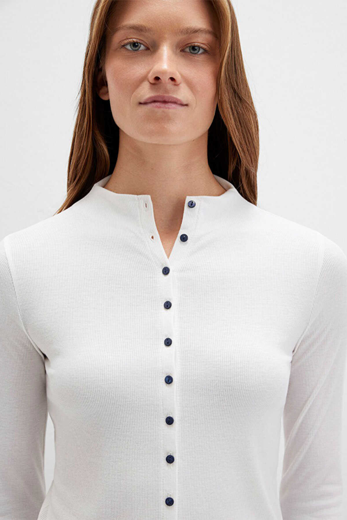 Mavi nin kadın koleksiyonundan Düğme Detaylı Ekru Tişört.-Ürün Kodu: 1613695-70057-Kumaş Bilgileri-%61 Polyester-%35 Viskoz-%4 Elastan-Menşei: Türkiye-