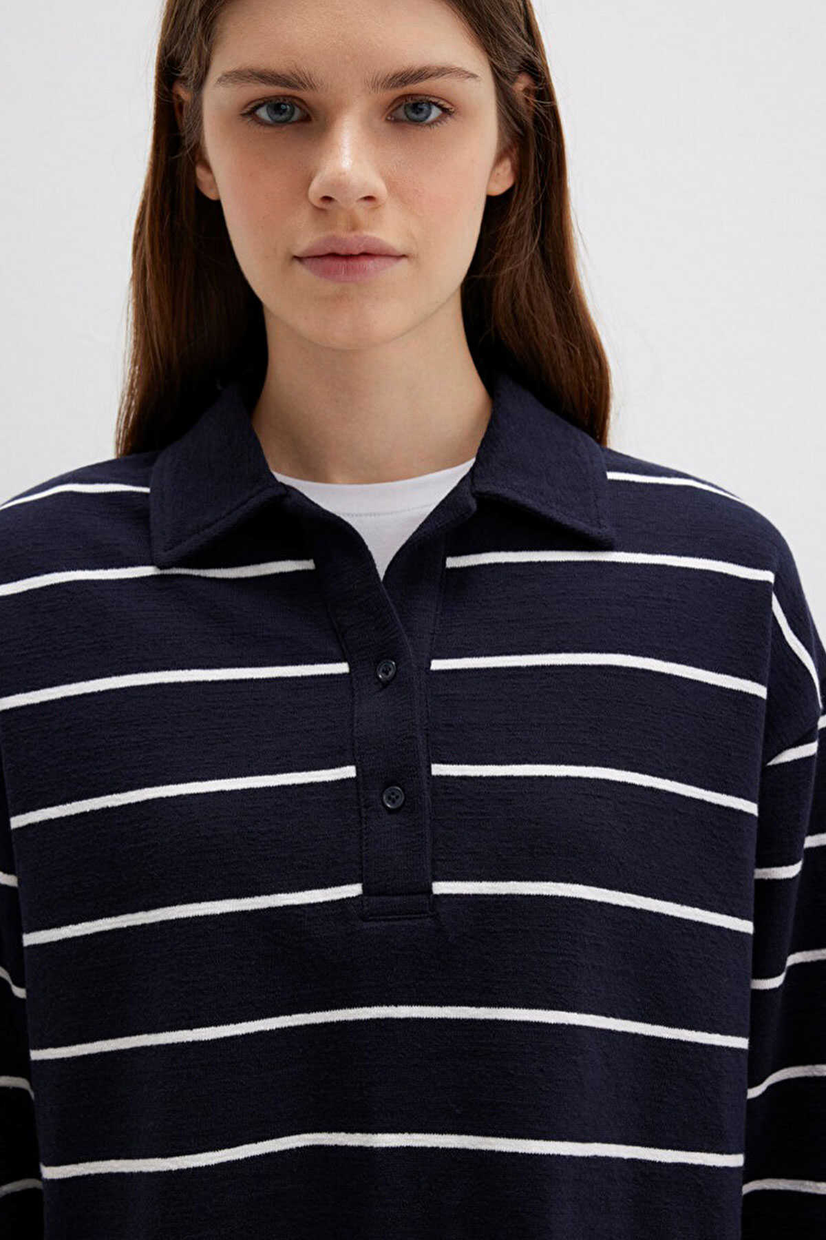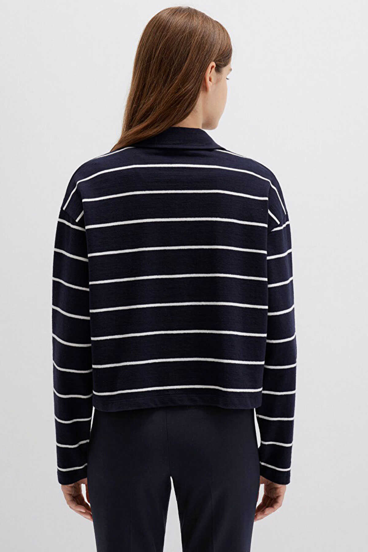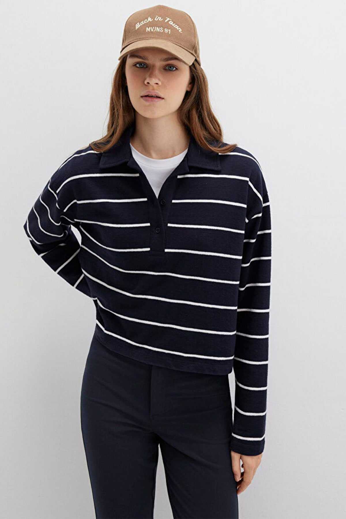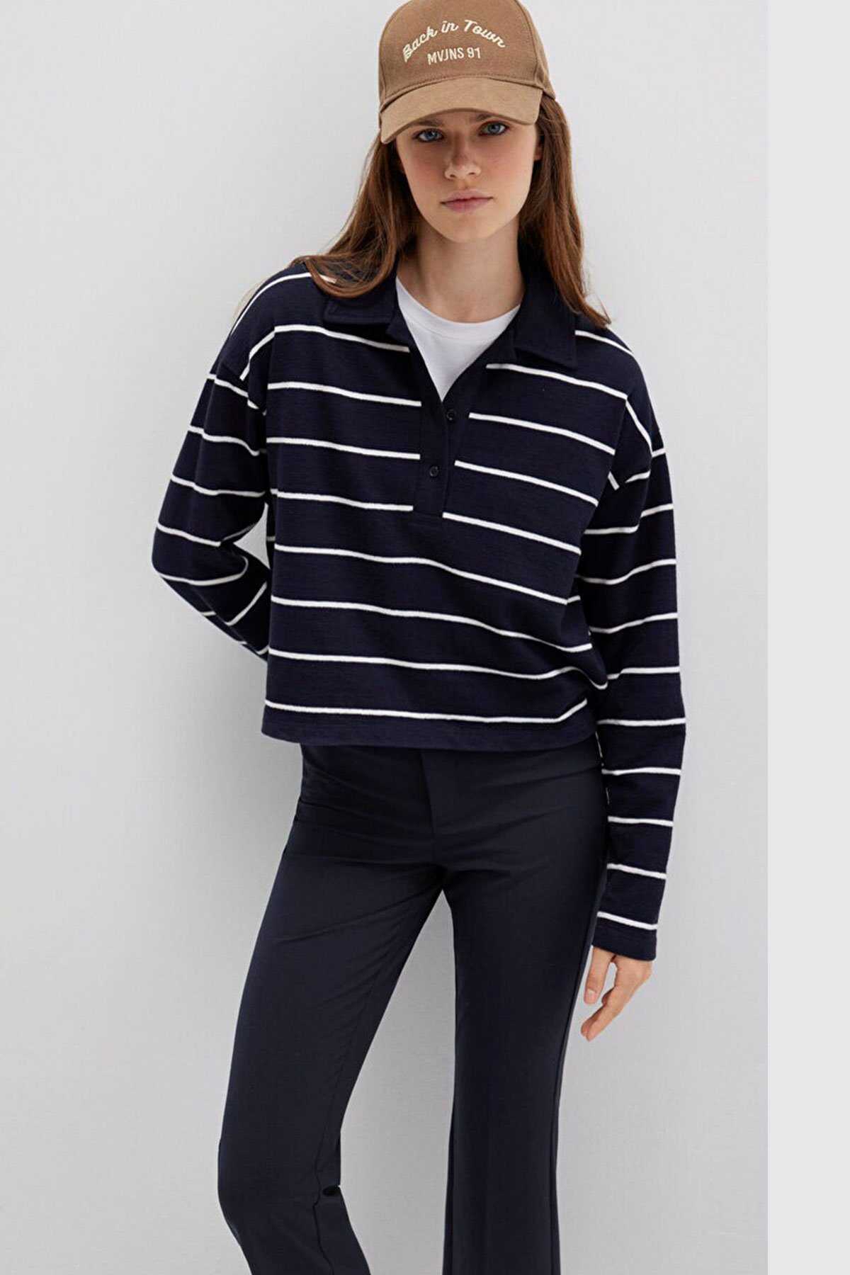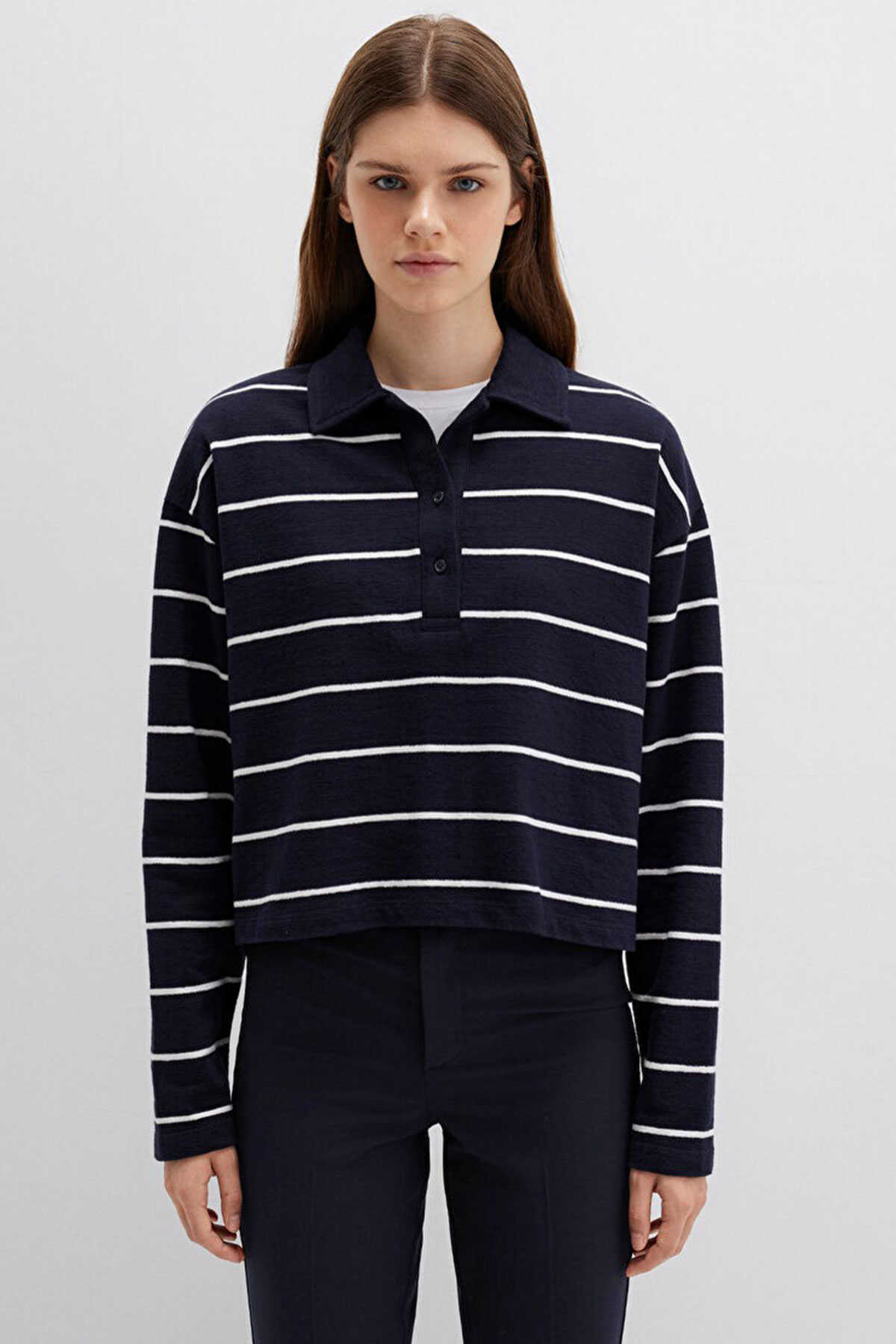 Mavi nin kadın koleksiyonundan Çizgili Lacivert Polo Tişört. - Boxy Fit - Ürün Kodu: 1612813-87988 - Kumaş Bilgileri - %100 Pamuk - Manken Ölçüleri - Alt: Bel: S Üst: S - Boy: 177 cm Bel: 61 cm Göğüs: 85 cm Kalça: 90 cm - Menşei: Türkiye