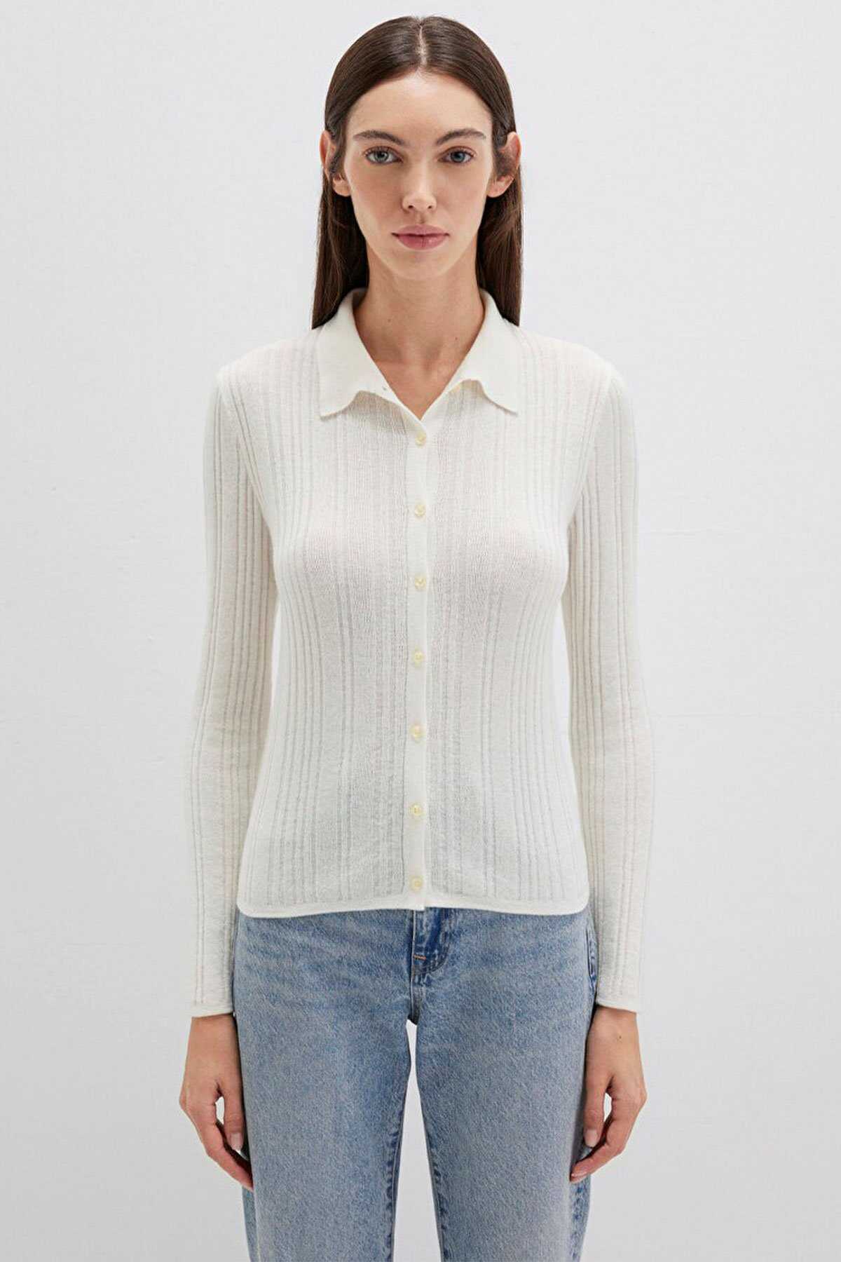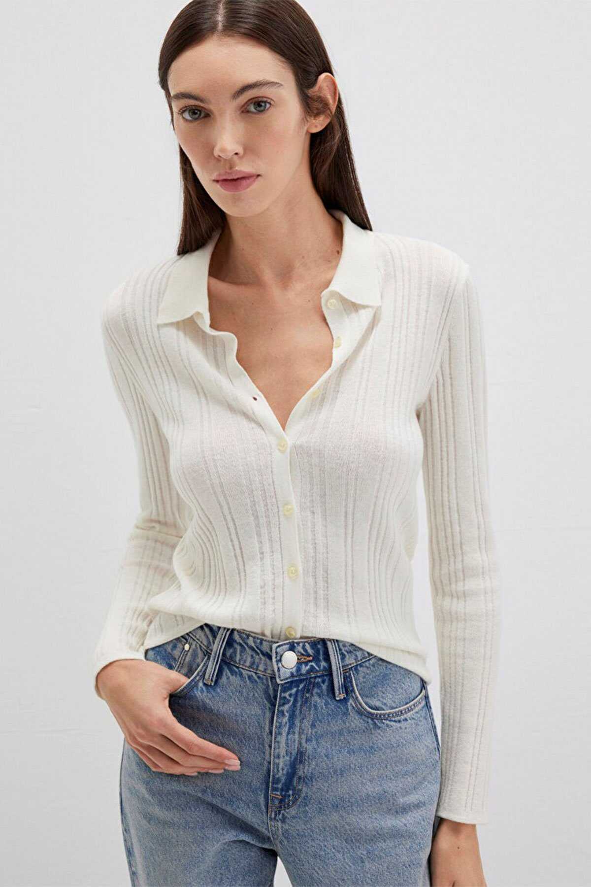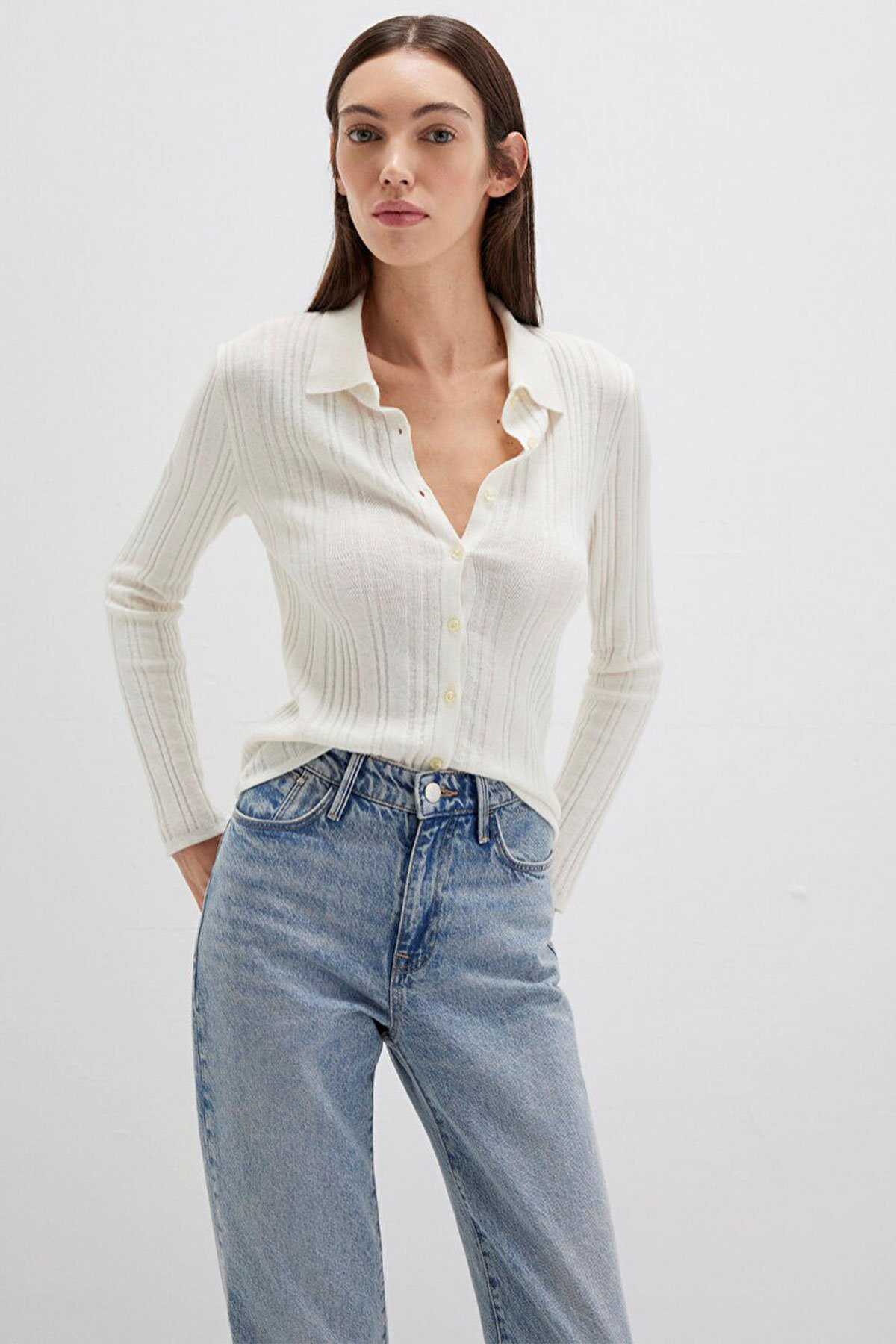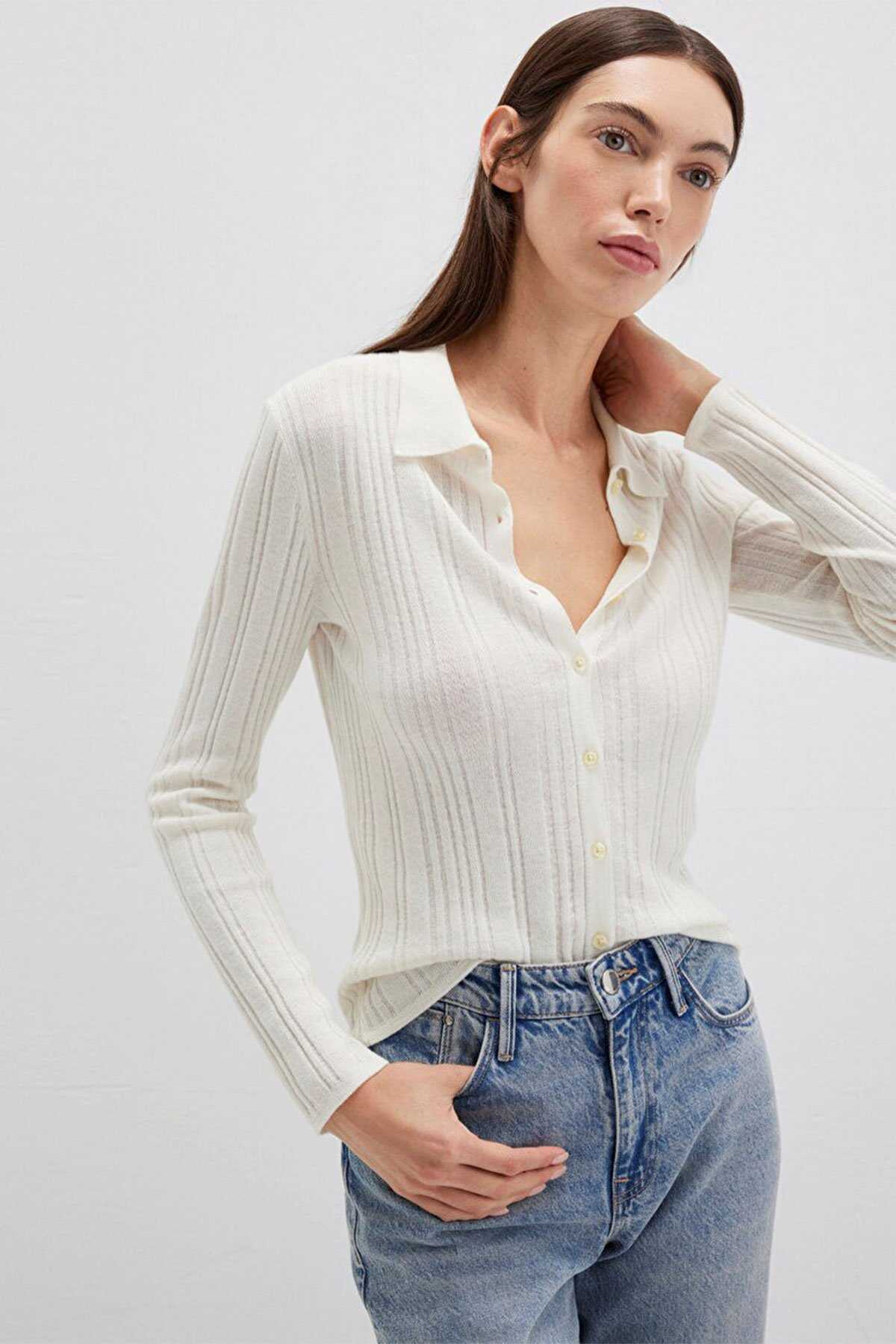 Mavi nin kadın koleksiyonundan Yün Karışımlı Ekru Triko Polo.-Ürün Kodu: 1710838-80194-Kumaş Bilgileri-%41 Viskoz-%31 Polyamit-%28 Yün (Koyun Yünü)-Menşei: Türkiye-