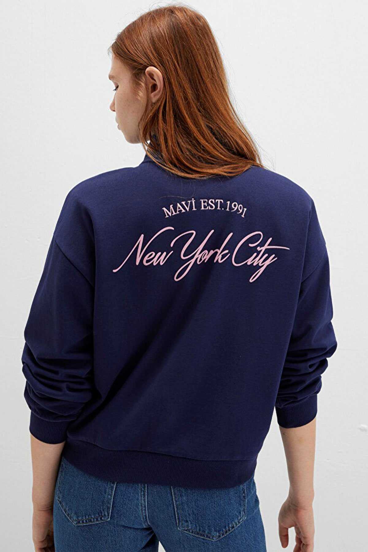 Mavi nin kadın koleksiyonundan Yarı Fermuarlı Sırt Baskılı Lacivert Sweatshirt. -Şardonlu yarı fermuarlı dik yaka.-Ürün Kodu: 1S10501-80729-Kumaş Bilgileri-%70 Pamuk-%30 Polyester-Menşei: Türkiye-